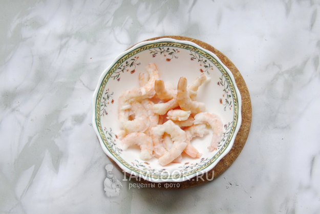 Варено-мороженые креветки залейте кипятком. Дайте постоять 10 минут. После промойте. Очистите от панциря и кишечной вены.