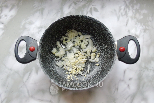 Репчатый лук и чеснок очистите и помойте. Затем нарежьте произвольно и выложите в кастрюлю с толстым дном или антипригарным покрытием. Налейте растительное масло.