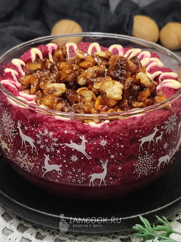 В блюдо (салатник) выложите подготовленный свекольный салат с хреном, по желанию можно оформить верх майонезом, в центр выложите обжаренные орешки. Салат получается сочным, пикантным и очень вкусным!!