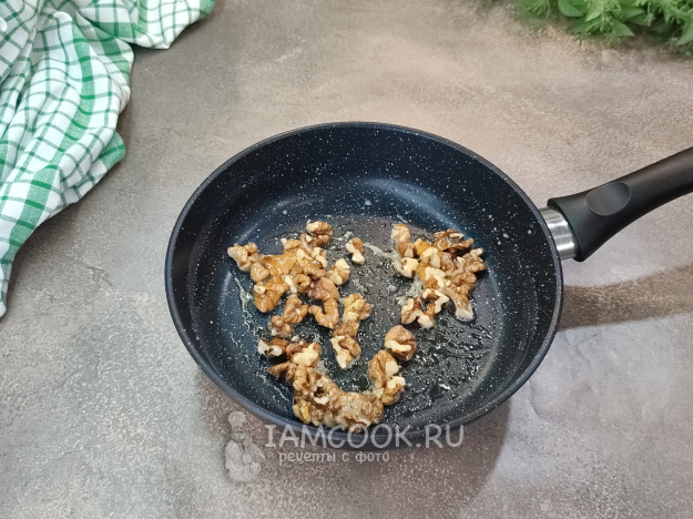 Сначала на сухой сковороде обжарьте орехи, помешивая, пару минут, затем добавьте к ним мед, перемешайте, прогрейте минутку - орешки покроются медовой глазурью, появится приятный карамельный аромат.