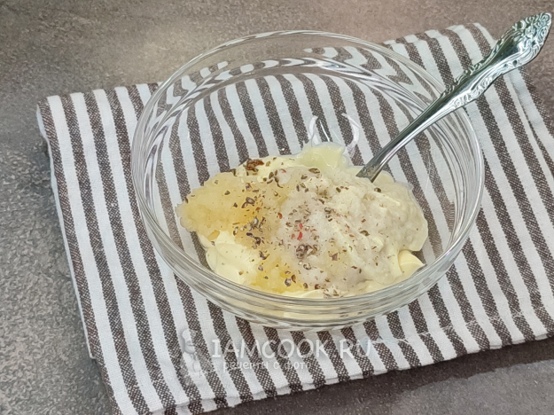 Для заправки соедините майонез, хрен, измельченный чеснок, перец по вкусу.