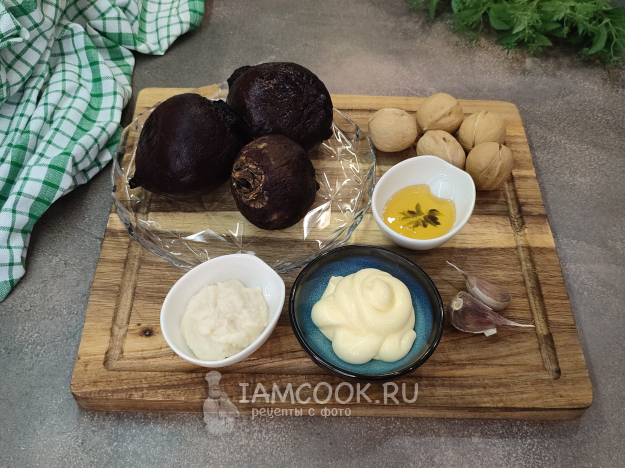 Соберите ингредиенты для приготовления салата из свеклы с хреном. Хрен выбирайте сливочный (не столовый), вкусный, такой, который вы хотели бы есть прямо ложкой)). Хочется, чтобы у салата была текстура, поэтому предлагаю добавить еще и орешков. Немного.