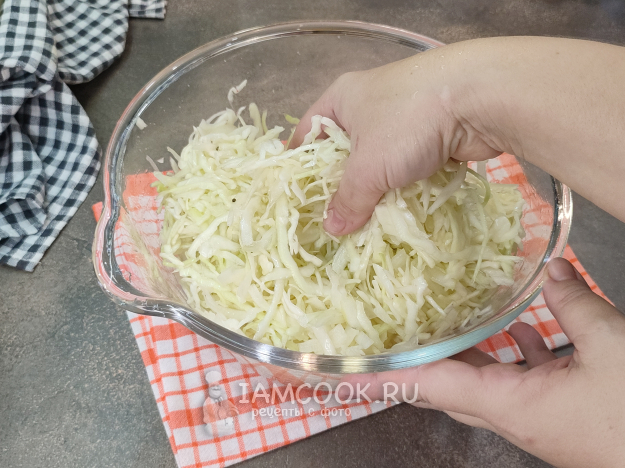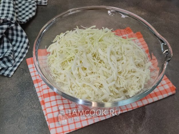 Нашинкуйте капусту. Для удобства перемешивания выложите ее в большую емкость.