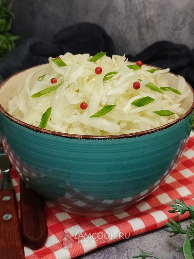 Маринованная капуста по-немецки готова! Это уже полностью готовый хрустящий, вкуснейший салат, он приправлен и специями, и уксусом, и маслом. Вам останется лишь достать баночку из холодильника и выложить капусточку в салатник. Ну разве что зелени сверху добавить и перчика по желанию. Подавайте капусту как салат или, например, как гарнир к колбаскам, мясу или курице.