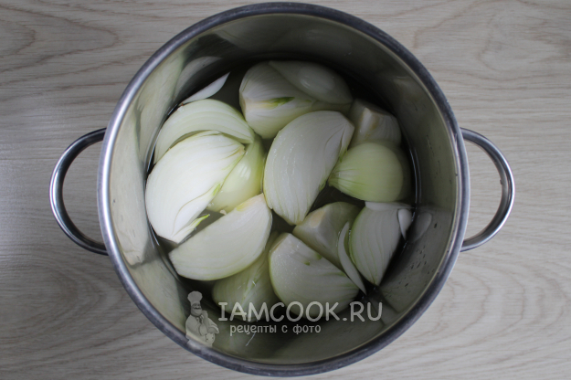 Крупные луковицы нарежьте на 2-4 части, а мелкие можно оставить целыми. Поместите в кастрюлю. Налейте воды так, чтобы она была вровень с луком, доведите до кипения, затем убавьте огонь до слабого и варите под крышкой до готовности.