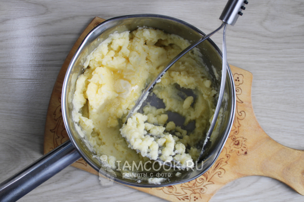 С картофеля тоже слейте бульон, добавьте горячее молоко и сделайте пюре при помощи толкушки. Молока добавляйте по минимуму, только от потемнения картофеля. Расплавьте на горячем пюре кусочек сливочного масла.