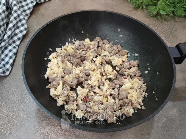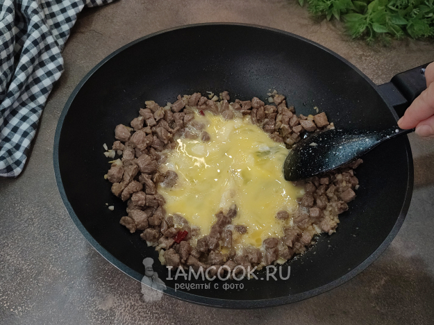 Дайте яйцам немного схватиться и перемешайте их с говядиной.