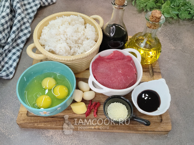 Соберите ингредиенты для приготовления жареного риса с говядиной по-китайски. У меня говядина сырая, но подойдет и отварная, если вдруг у вас в холодильнике от приготовления какого-нибудь салата осталась. Рис используем вчерашний, остывший. Варю рис 1:1 с водой, т.е. на полтора стакана риса беру полтора стакана воды, после закипания огонь уменьшаю на слабый, варю под крышкой до готовности.