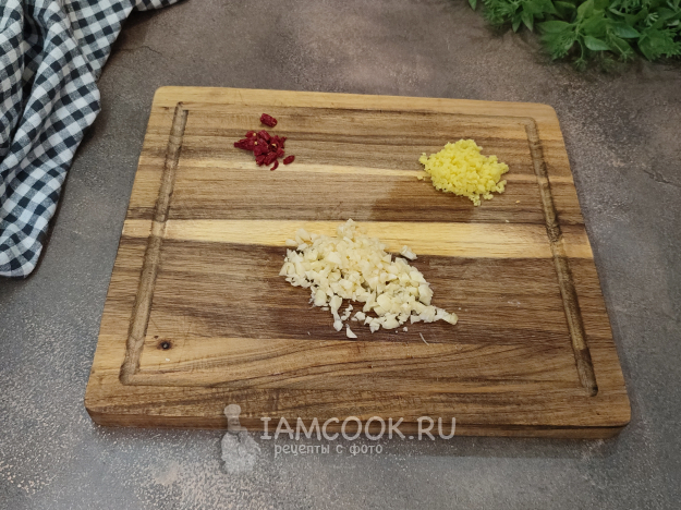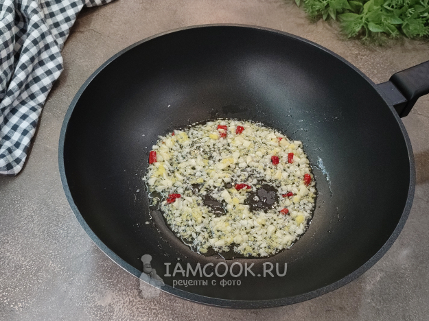 В сковороде разогрейте масло, обжарьте чили, чеснок, имбирь 20-30 секунд.