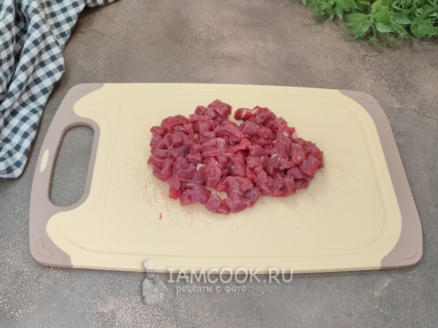 Зачищенную от пленок, прожилок говядину нарежьте мелким кубиком.