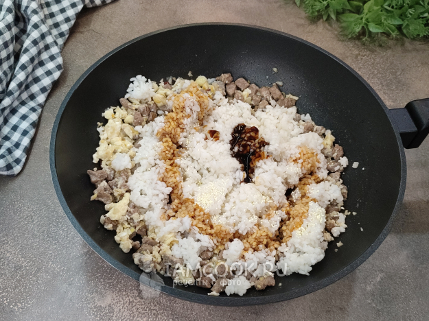Выкладываем в сковороду рис, добавляем соевый, устричный соусы, куриный порошок, тщательно перемешиваем.