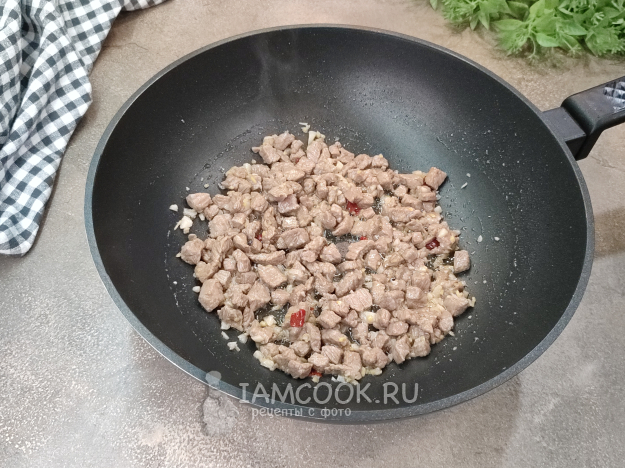 Выложите говядину, обжарьте, часто помешивая, до изменения цвета и мягкости.