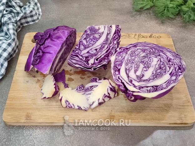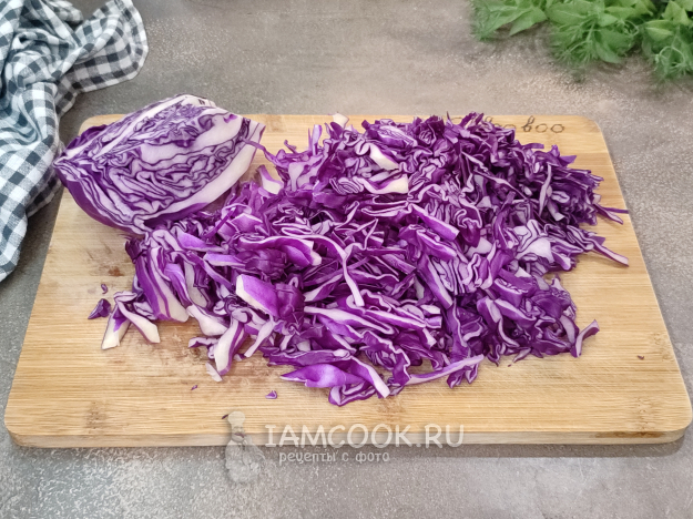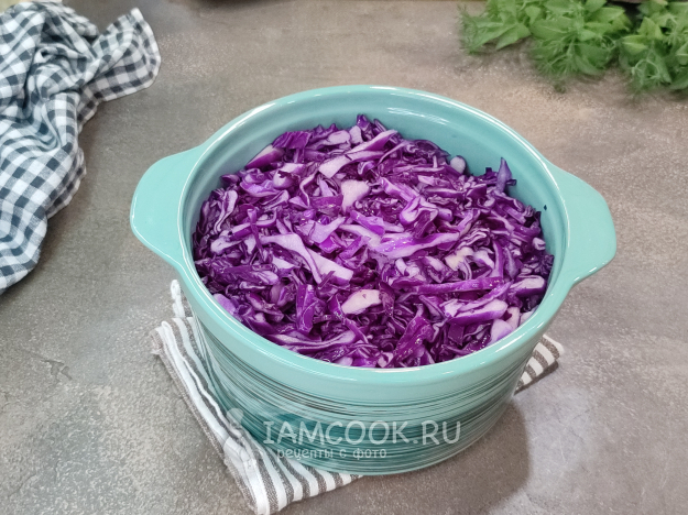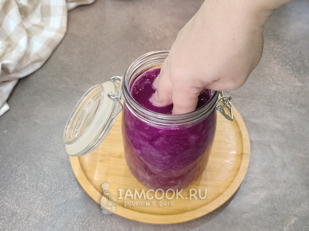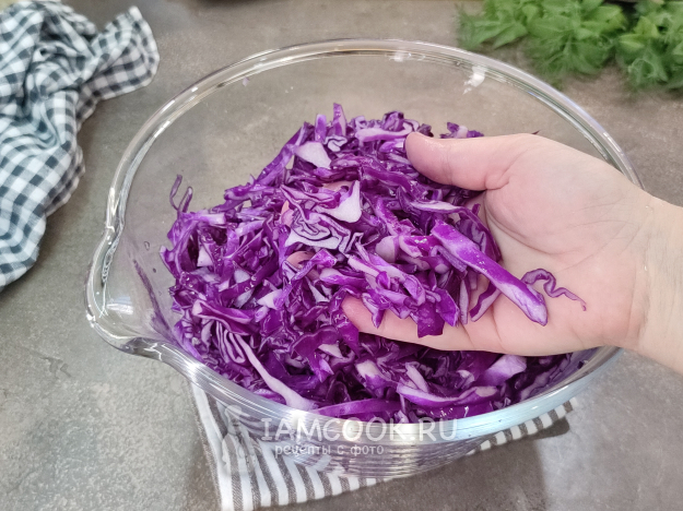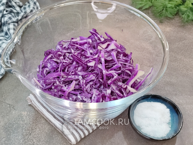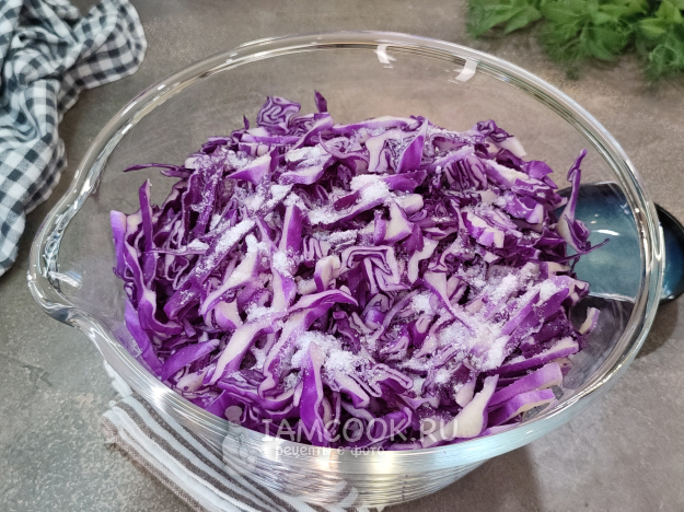 Краснокочанная капуста несколько жестче, чем белокочанная. Поэтому при перемешивании капусты с солью нужно помочь капусте выделить сок, для этого ее нужно перетирать, мять руками во время перемешивания.