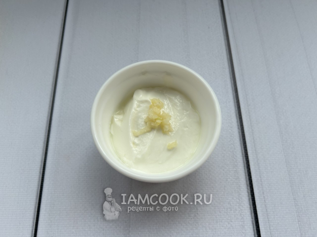 В отдельной миске смешайте мацун (или йогурт) с чесноком, пропущенным через пресс. Хорошо перемешайте соус.