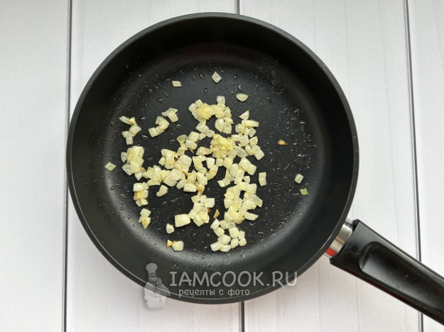 Мелко нарежьте репчатый лук и обжарьте его на топлёном масле до золотистого цвета.