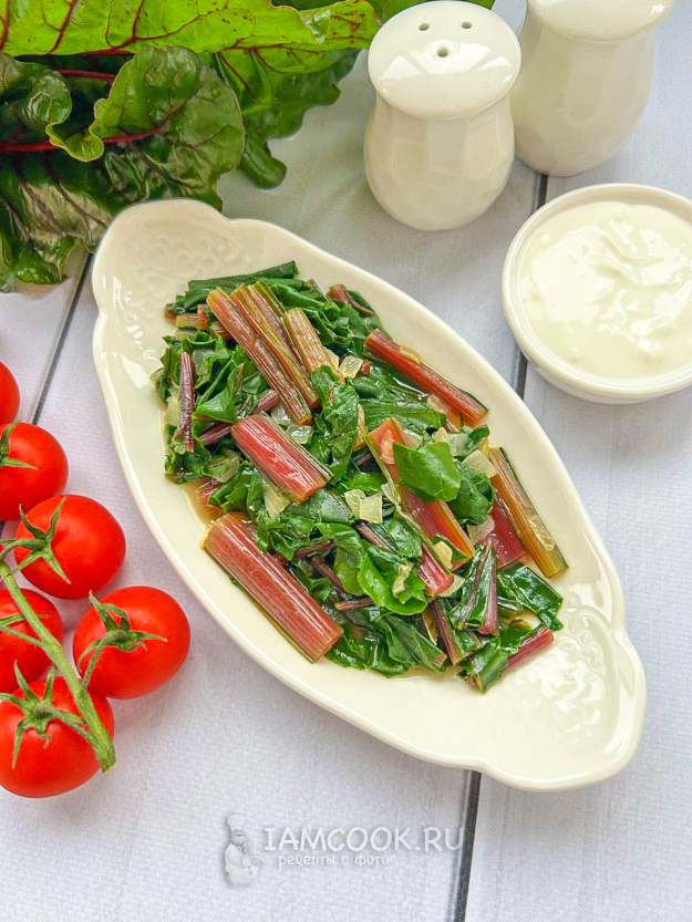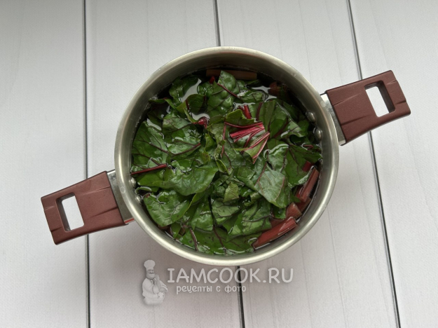 Отварите ботву в подсоленной воде 5-6 минут, до мягкости. Если используете жёсткие черешки, сначала отварите их, а затем добавьте листья. Таким образом вы добьетесь равномерной готовности. Откиньте ботву на сито, чтобы удалить лишнюю воду.
