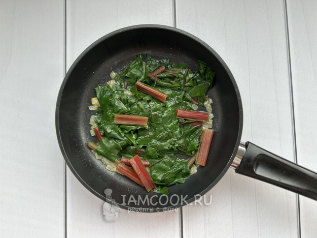 Переложите отваренную ботву на сковороду к обжаренному луку и перемешайте (попробуйте на вкус, при необходимости добавьте соль). Слегка прогрейте на медленном огне.