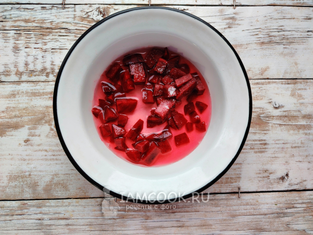 Поместить свекольные кубики в металлическую посуду. Влить воду. Добавить сахар и несколько кристаллов лимонной кислоты, чтобы свекла не потеряла свой цвет при варке. Поставить посуду на огонь. Проварить в течение 25 минут на среднем огне, выключить огонь. Оставить в сиропе до полного остывания смеси.