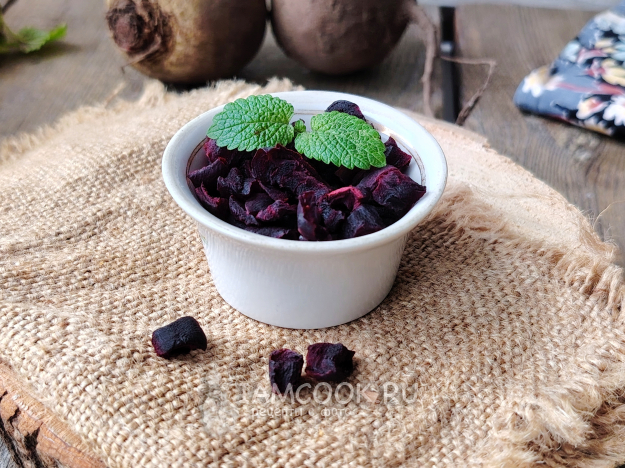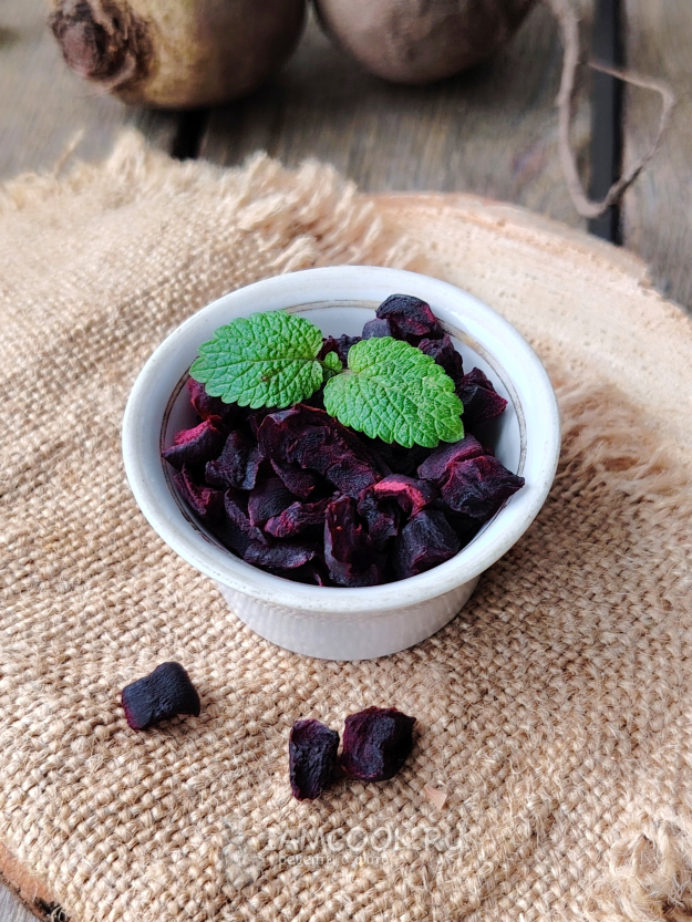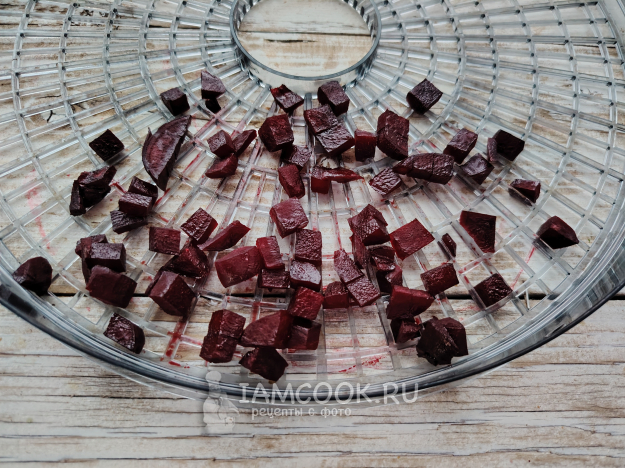 Свекольные кубики выложить на поддон электросушилки. Сушить цукаты из свеклы при температуре 45-50 градусов в течение 6-7 часов.