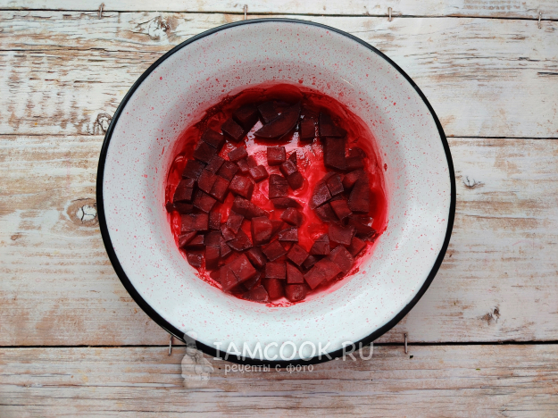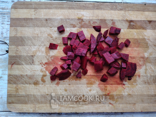 Свеклу помыть, снять кожицу, мякоть нарезать кубиками.