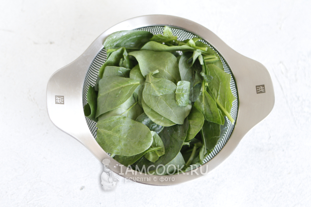 Подготовьте листья шпината. Промойте их, обсушите. Удалите жесткие стебельки.