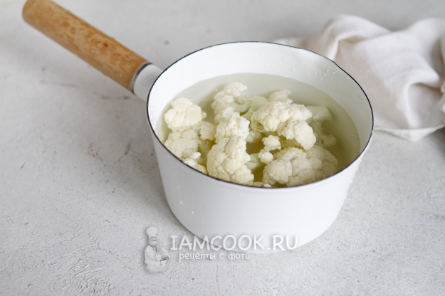 Доведите воду до кипения, слегка посолите и убавьте огонь. Варите цветную капусту 4-5 минут. Далее откиньте ее на дуршлаг и слегка остудите.