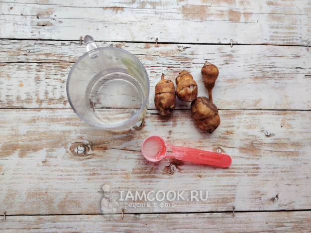 Собрать по списку продукты для приготовления чая из топинамбура. Количество сахара можно изменить по вкусу или исключить его полностью, если вы предпочитаете чаи без добавления подсластителей. Также можно использовать мед, лимон в качестве добавок к напитку.