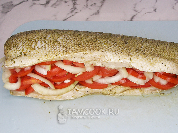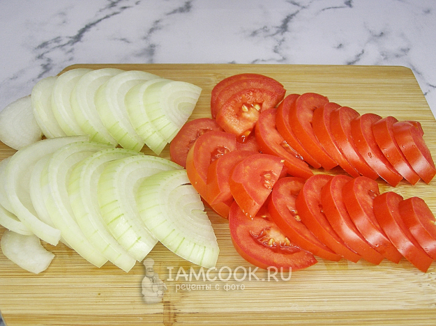 Для фарширования муксуна нарезаем лук и помидоры полукольцами.