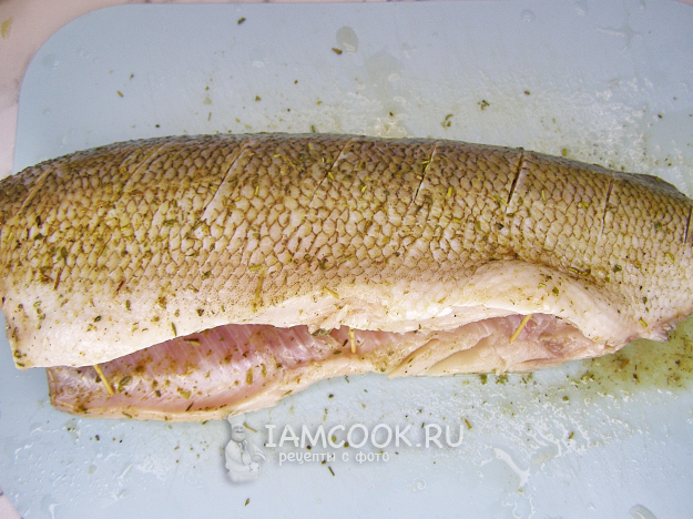 Делаем на коже несколько диагональных надрезов приблизительно 2-3 мм глубиной. Поливаем рыбу соком половины лимона и смазываем приправой для рыбы снаружи и внутри. Оставляем рыбу просаливаться на час.