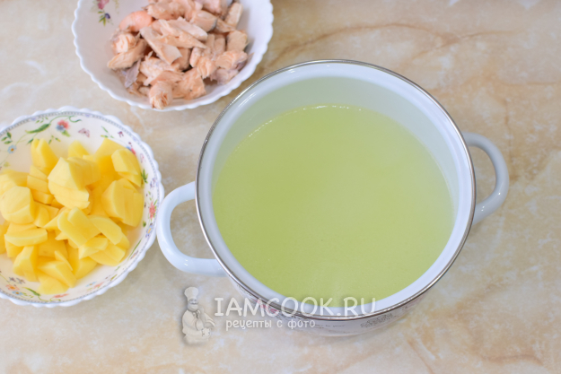 Затем рыбу извлеките. Немного остудите и отделите от костей. Бульон процедите и доведите до кипения. Отправьте в него нарезанный картофель и рыбу.