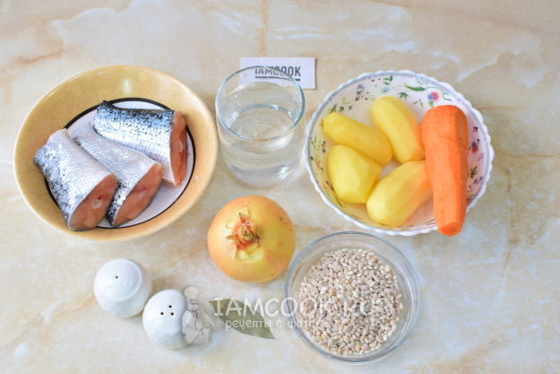 Чтобы приготовить уху из форели с перловкой, соберите необходимые ингредиенты по списку. Для варки можно взять любые части рыбы. Я буду готовить из хвостов.