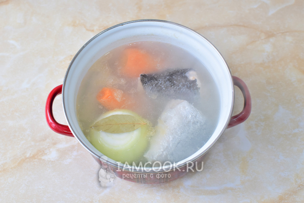 Рыбу залейте водой и поставьте на огонь. Доведите до кипения и оставьте вариться на 15 минут.