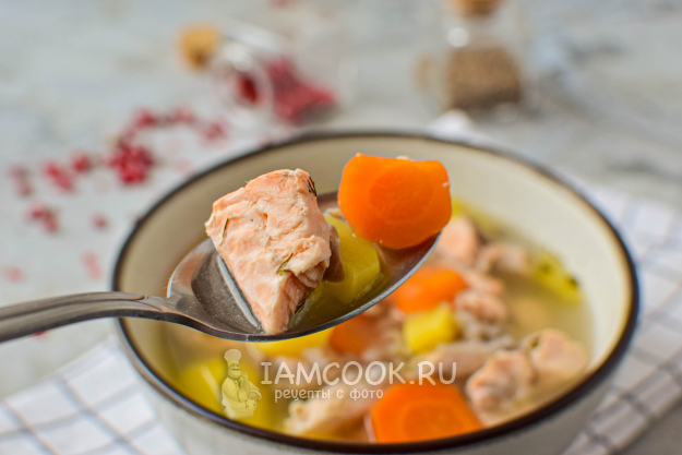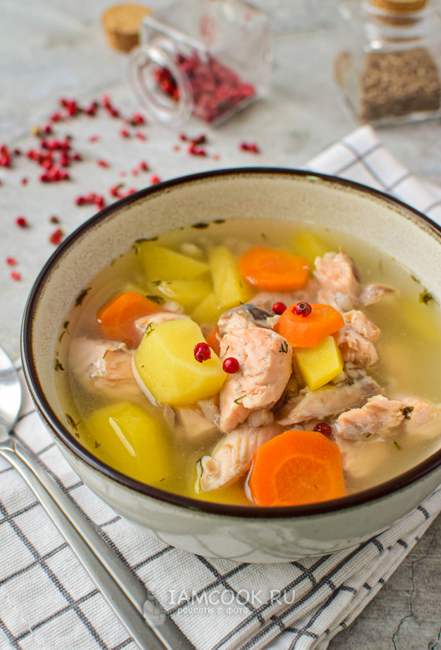 Уха из форели с перловкой готова! Разлейте по тарелкам и подавайте к столу. Приятного аппетита!
