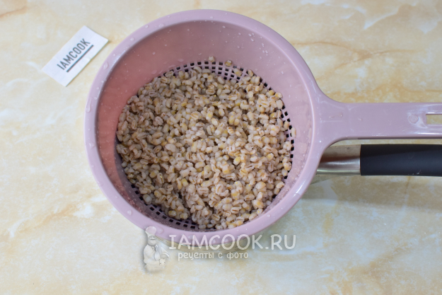 Затем отварите перловку 15-20 минут. Готовую крупу откиньте на дуршлаг и пролейте холодной водой.