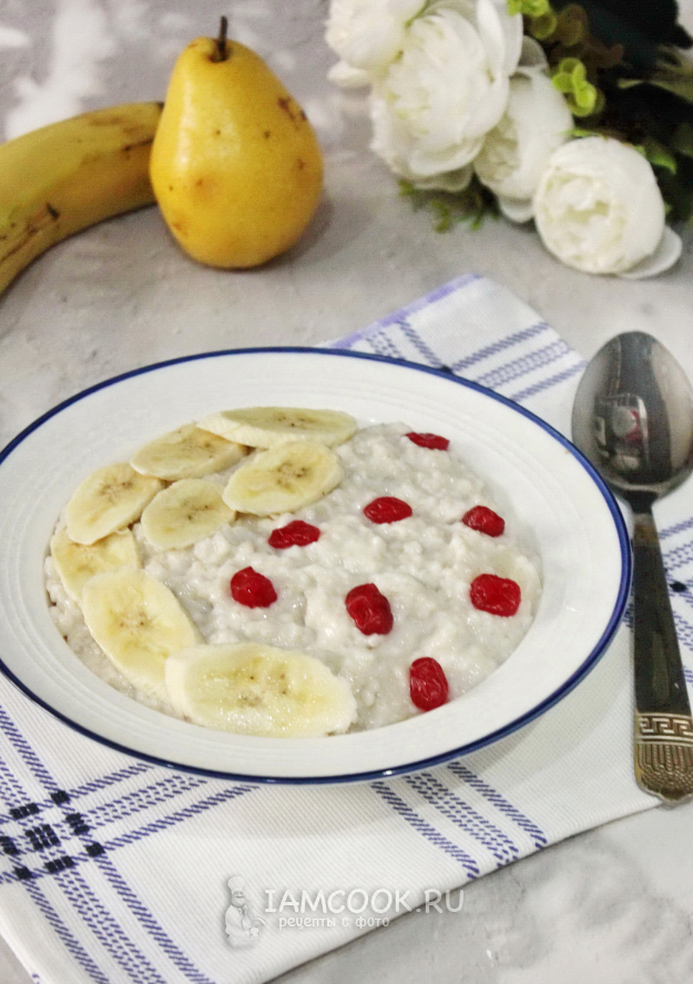 Банан очистите, нарежьте кружками, выложите на кашу и подавайте к столу. Я еще украсила вяленой вишней.