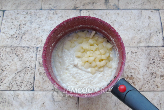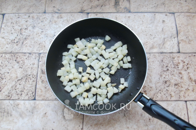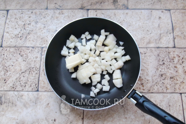 Грушу помойте, очистите, удалите сердцевину. Нарежьте небольшими кубиками и выложите в сковороду со сливочным маслом.