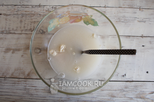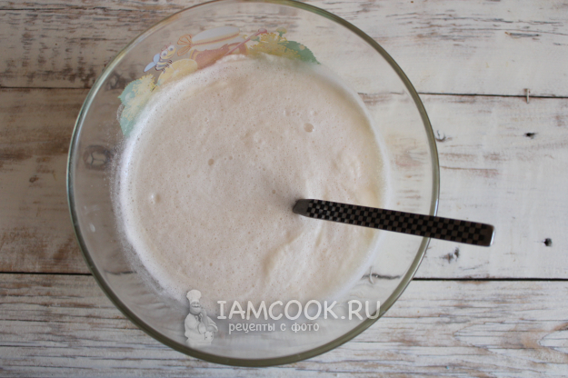 Поставить посуду с жидкостью в теплое место. Чтобы дрожжи быстрее активировались, можно посуду затянуть пищевой пленкой. На поверхности смеси должна появиться пышная пена. Влить растопленное и остуженное до комнатной температуры сливочное масло, вбить яйцо, добавить соль, размешать массу.