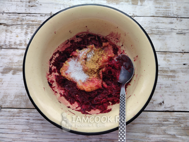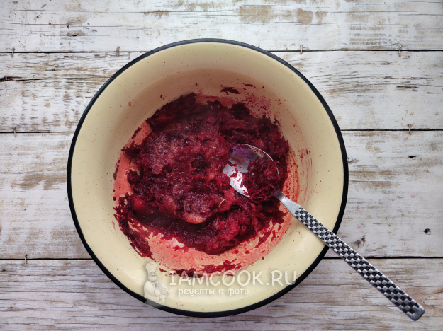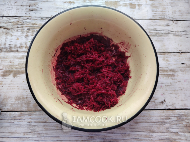 Пока тесто выстаивается, подготовить начинку. Свеклу натереть на терке с мелкой ячейкой. Влить немного воды и потушить в течение 15 минут на среднем огне, до мягкости овощной стружки.