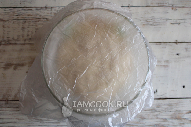 Затем собранное в шар тесто снова поместить в посуду и затянуть ее пленкой, оставить в тепле на пару часов. За это время пару раз обмять тесто ложкой.