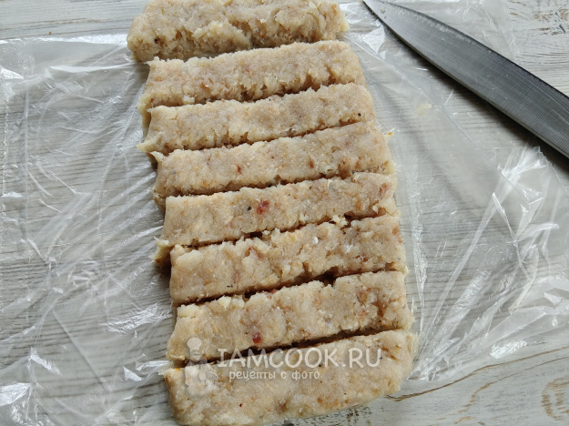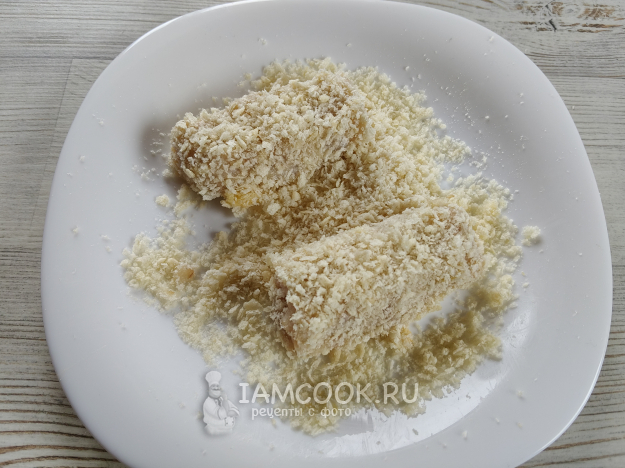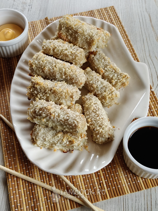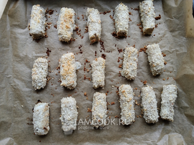 Фарш получился влажным, поэтому обваляла палочки просто в сухарях, хотя изначально планировала делать стандартную панировку: мука-яйцо-сухари.