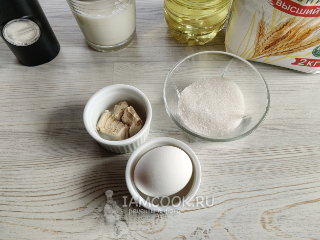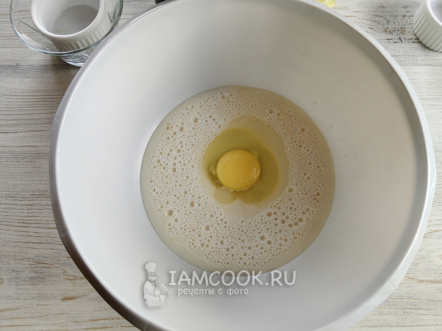 В теплом молоке развести сахар и дрожжи. Добавить соль и яйцо.