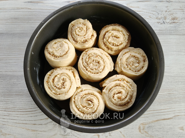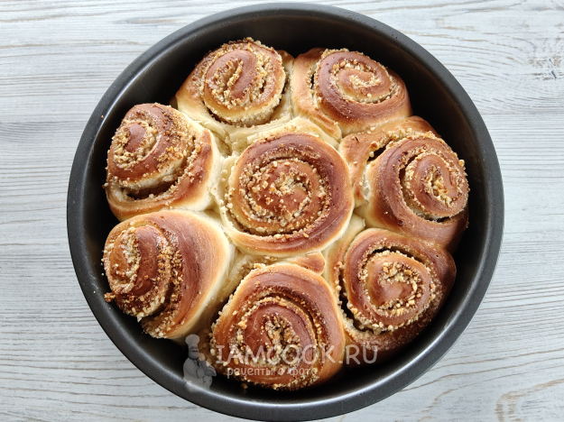 Выпекать синнабоны с орехами при температуре 180 градусов 20-25 минут. В начале выпекания можно прикрыть их фольгой.