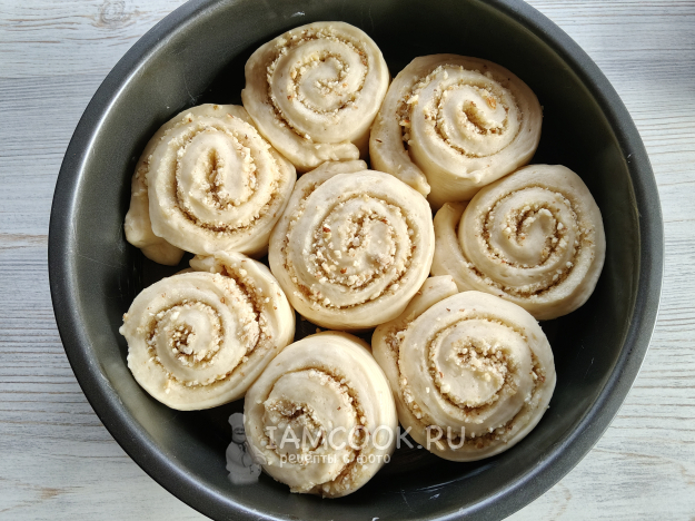 Переложить булочки в форму для выпечки (ее надо немного смазать маслом).