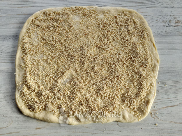 Тесто раскатать, смазать маслом, посыпать сахаром и орехами.