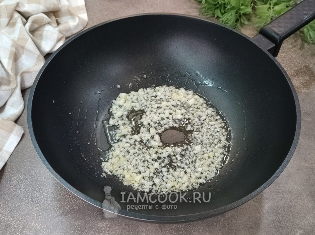 В сковороде побольше разогрейте пару ложек масла, выложите чеснок и имбирь, обжарьте 20-30 секунд.