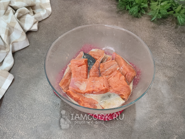 В эту смесь выложите рыбу, аккуратно перемешайте, отставьте пока в сторонку, пусть подмаринуется.