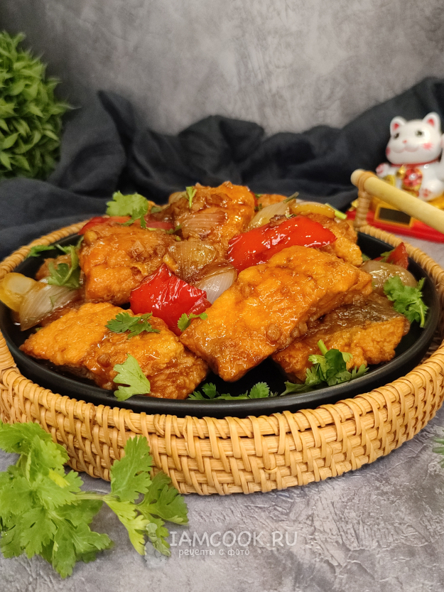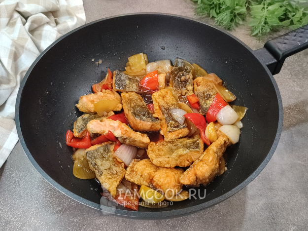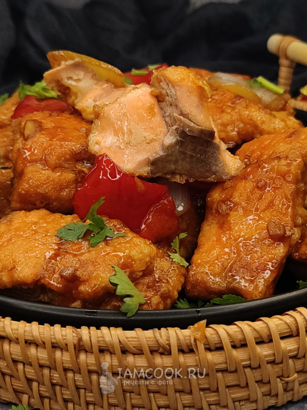 В соус с овощами выложите кусочки рыбы, аккуратно перемешайте, чтобы каждый кусочек рыбы был покрыт соусом. Прогрейте все вместе минутку, и можно подавать! По желанию в конце добавьте нарубленной кинзы или зеленого лука. Красная рыба в кисло-сладком соусе готова!