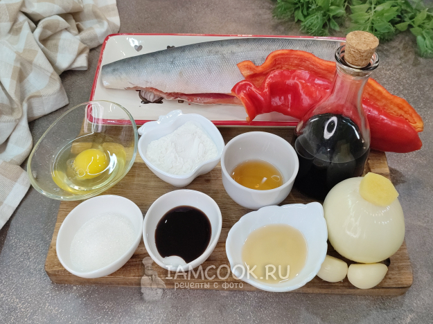 Соберите ингредиенты для приготовления красной рыбы в кисло-сладком соусе. Подойдет любая из лососевых, у меня была непотрошенная нерка, я ее помыла, удалила внутренности, голову (хотя китайцы бы голову точно оставили) и хвост.
