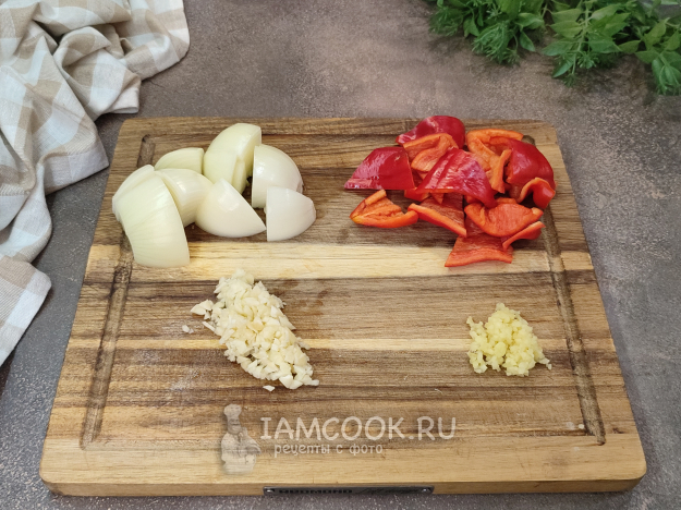 Нарежьте крупными ломтиками перец и лук, а чеснок и имбирь измельчите. У меня такую рыбу очень любит муж, а он не такой фанат чили, как я, поэтому сегодня вместо острого перца я использую сладкий, но вы, если любите, можете добавить острого перца).