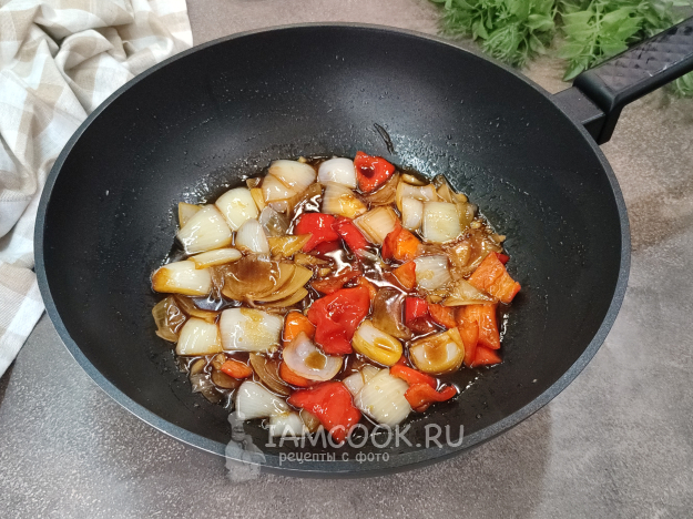 Добавьте в сковороду лук и перец, обжарьте, постоянно помешивая, 2-3 минуты. Лук станет прозрачным, перец станет чуть мягче.